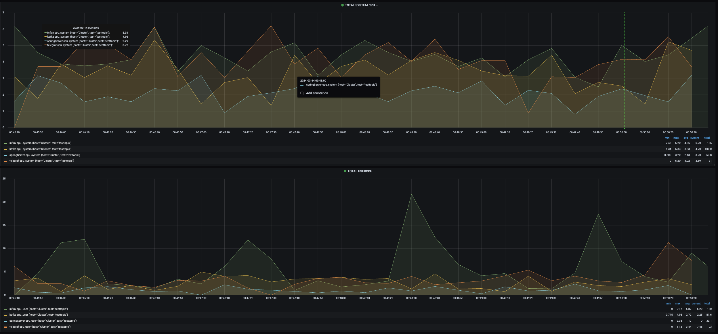 첫번째는 Total System cpu와 User cpu를 현재 가용중인 모든 서버를 대상으로 시각화 해놓았다.